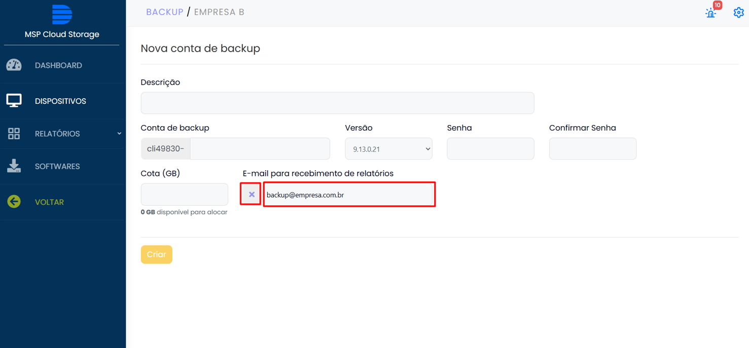 Ao criar uma conta dispositivo aparecerá um campo descrito como “E-mail para recebimento de relatórios”, que virá preenchido automaticamente com o e-mail do usuário que está fazendo a criação da conta ou o e-mail definido como padrão na criação do cliente.