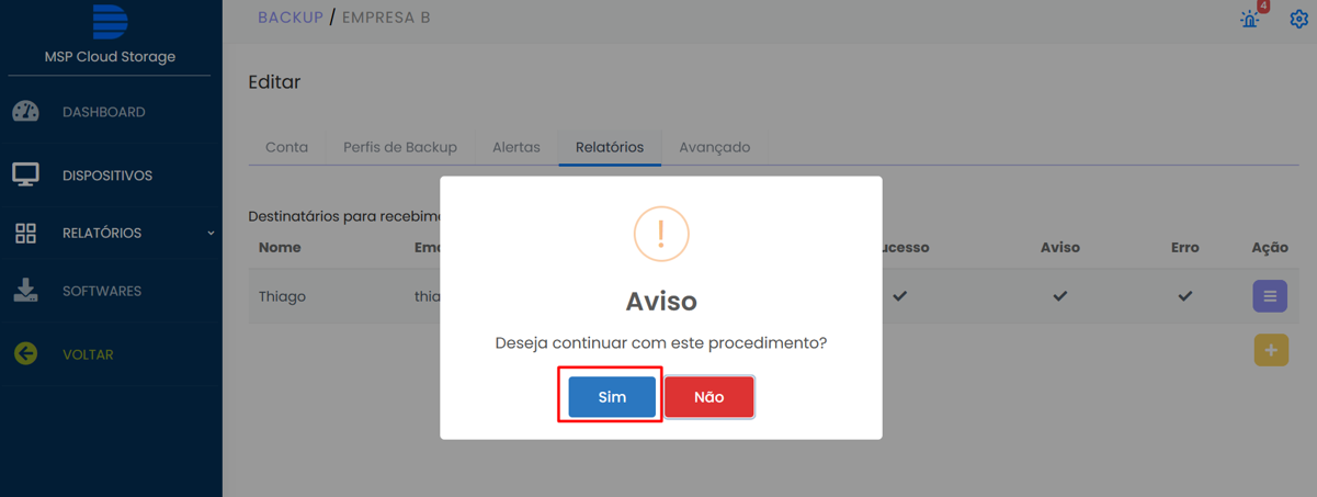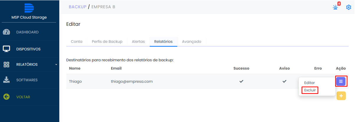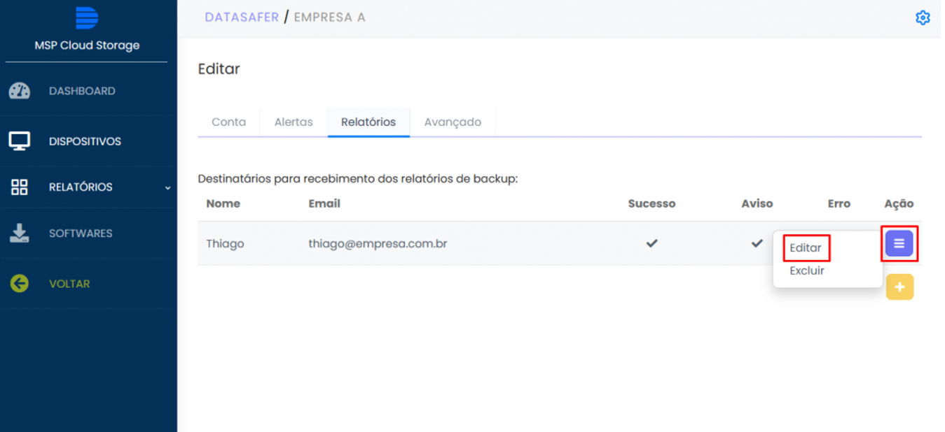 Após a criação da conta de dispositivo, caso queira, você poderá alterar os tipos de relatório ou até mesmo incluir novos e-mails para recebimento, basta seguir o procedimento do cenário 2.