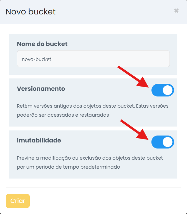 Passo 3: Defina um nome para o bucket, clique para ativar o “Versionamento” e a “imutabilidade” e em seguida clique em “Criar”: