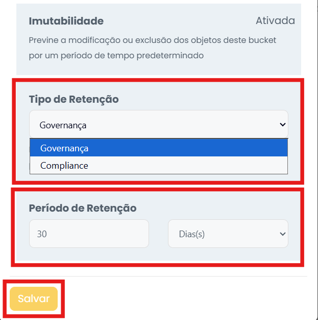 • Período de Retenção: define quanto tempo um objeto deve permanecer imutável. Durante este período, o objeto não pode ser modificado ou excluído. Após o término do período de retenção, o objeto pode ser gerenciado normalmente, a menos que um novo período de retenção seja definido.