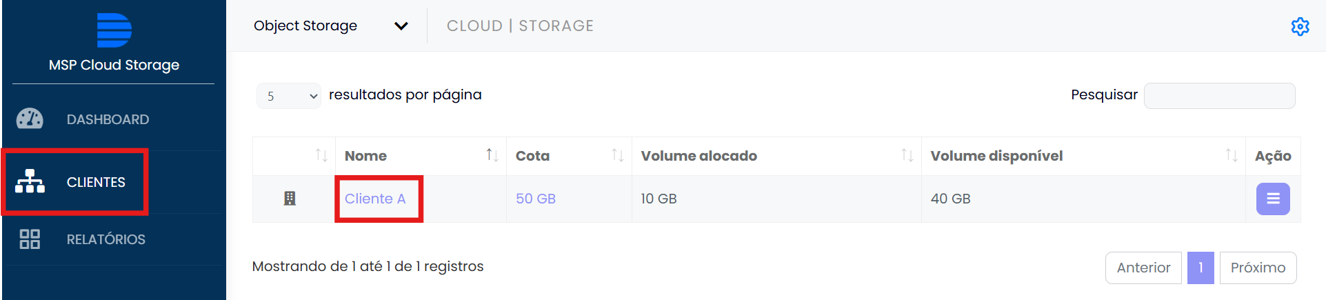 Passo 1: No portal, acesse o menu “Clientes” e em seguida clique no cliente que irá criar o novo bucket: