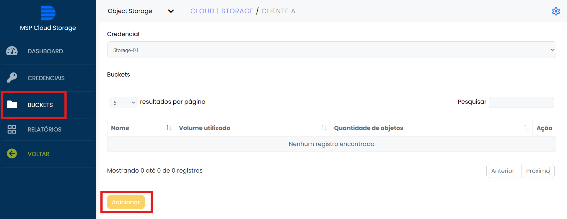 OBS: Se for o seu primeiro acesso na plataforma, é necessário criar primeiramente um cliente e um usuário para o cliente, conforme procedimento: https://docs.mspclouds.com/docs/utilizando-o-object-storage