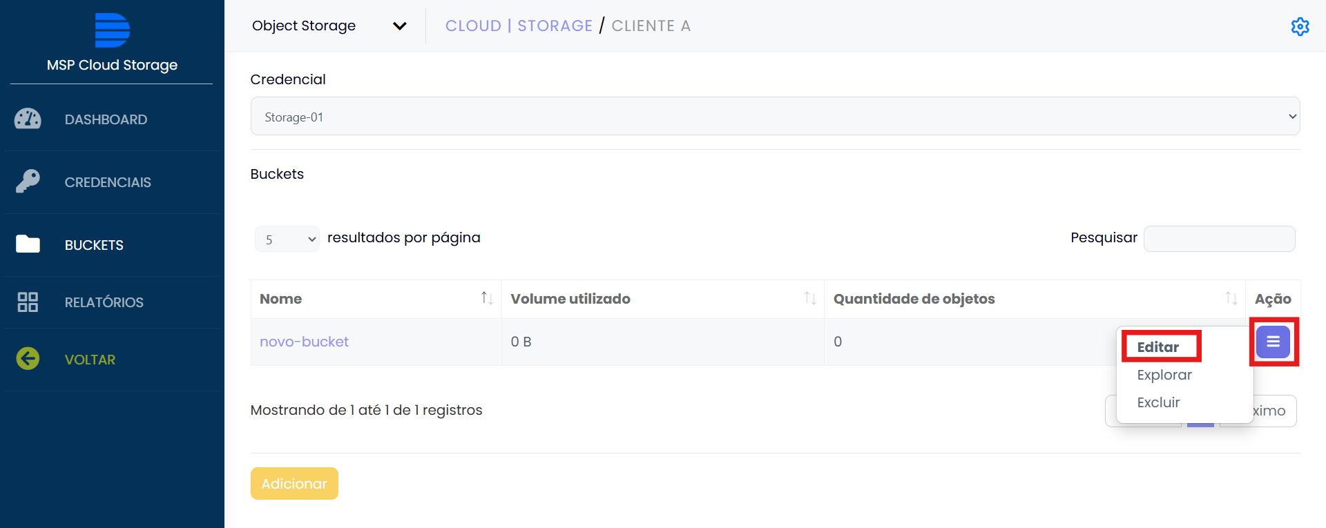 Passo 4: Após criado o bucket, é possível alterar as configurações padrões de tipo de retenção e período de retenção, para isso, no bucket desejado, clique no campo “Ação” e em “Editar”: