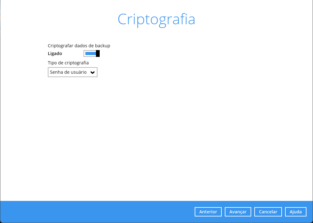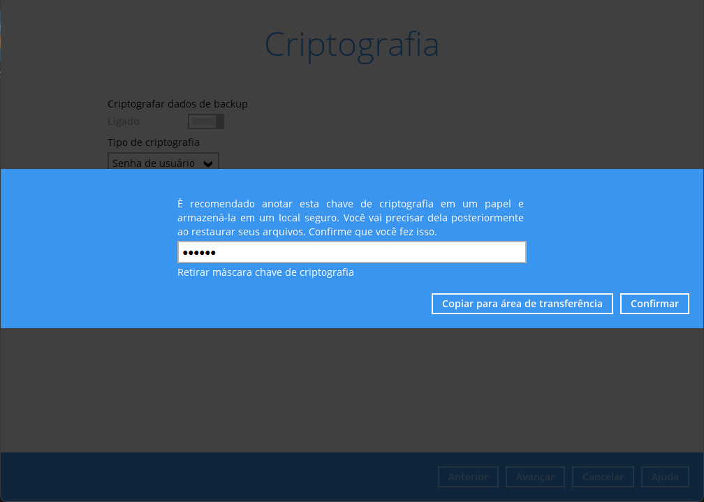Importante: Esta chave é exibida apenas uma única vez durante a criação do perfil de backup e não pode ser alterada posteriormente. Sua guarda é de inteira responsabilidade do usuário, sendo fundamental armazená-la em local seguro. A chave será indispensável para processos de restauração ou migração dos dados.